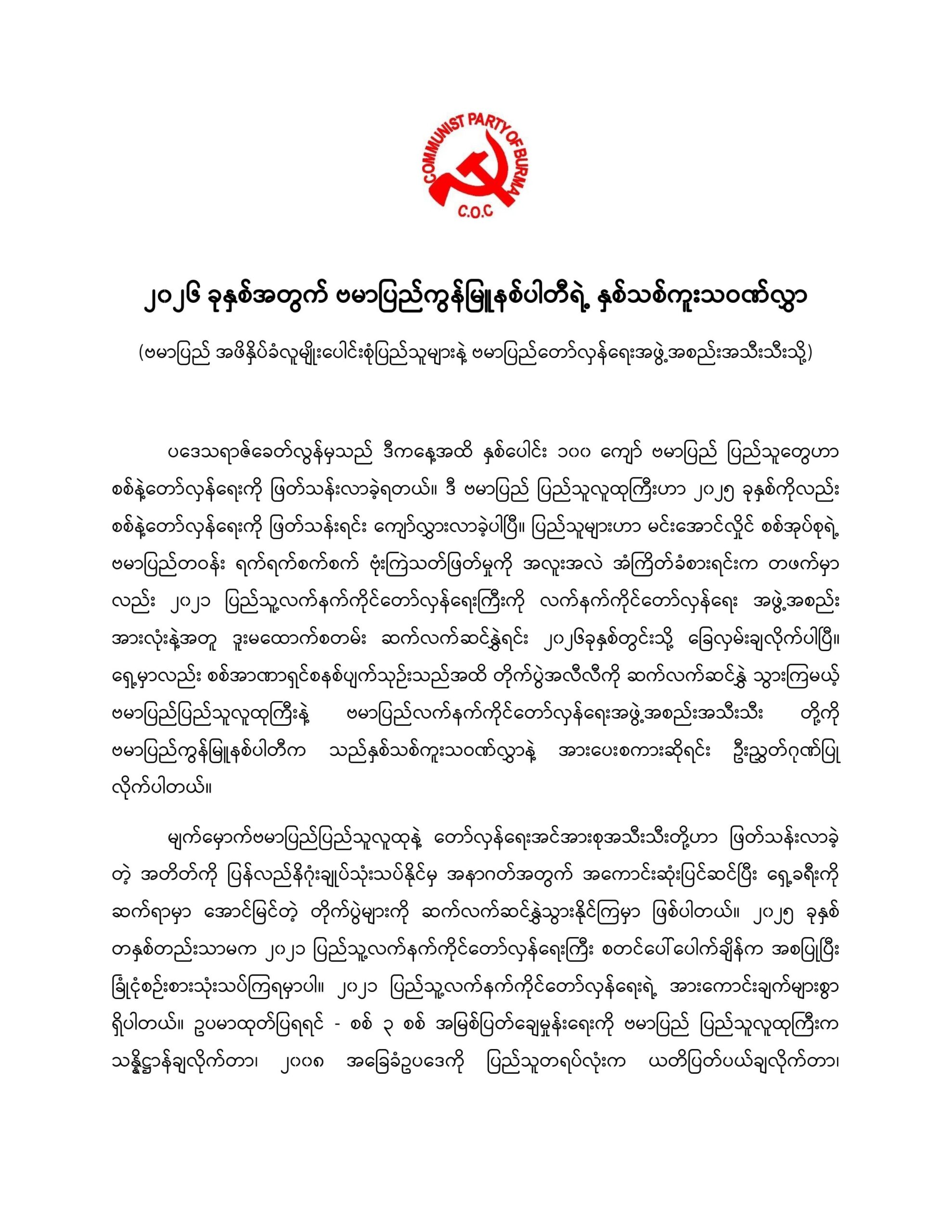 ၂၀၂၆ ခုနှစ်အတွက် ဗမာပြည်ကွန်မြူနစ်ပါတီရဲ့ နှစ်သစ်ကူးသဝဏ်လွှာ