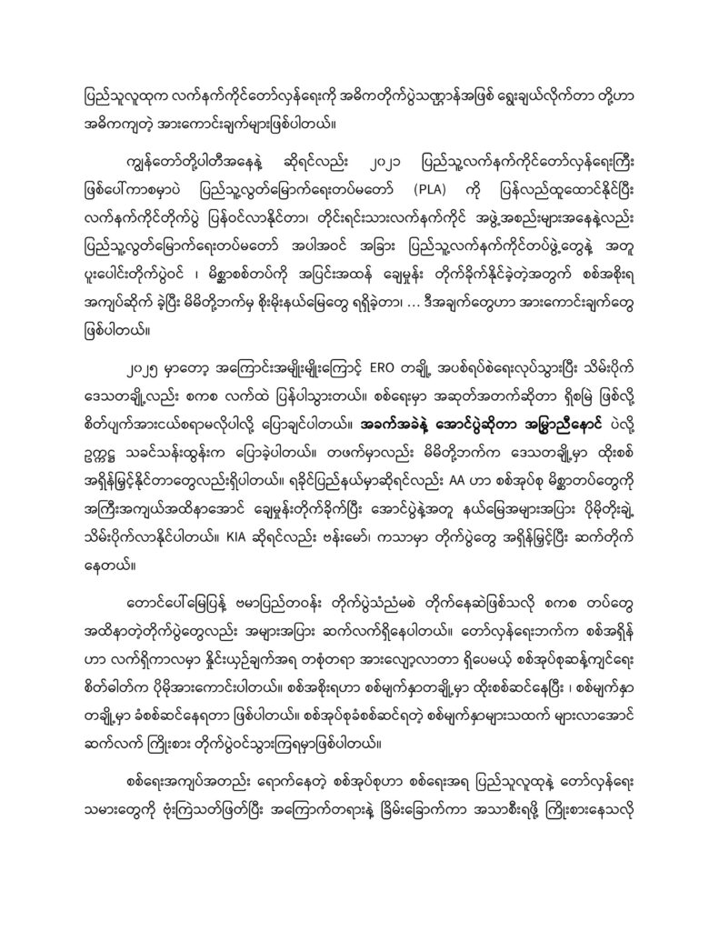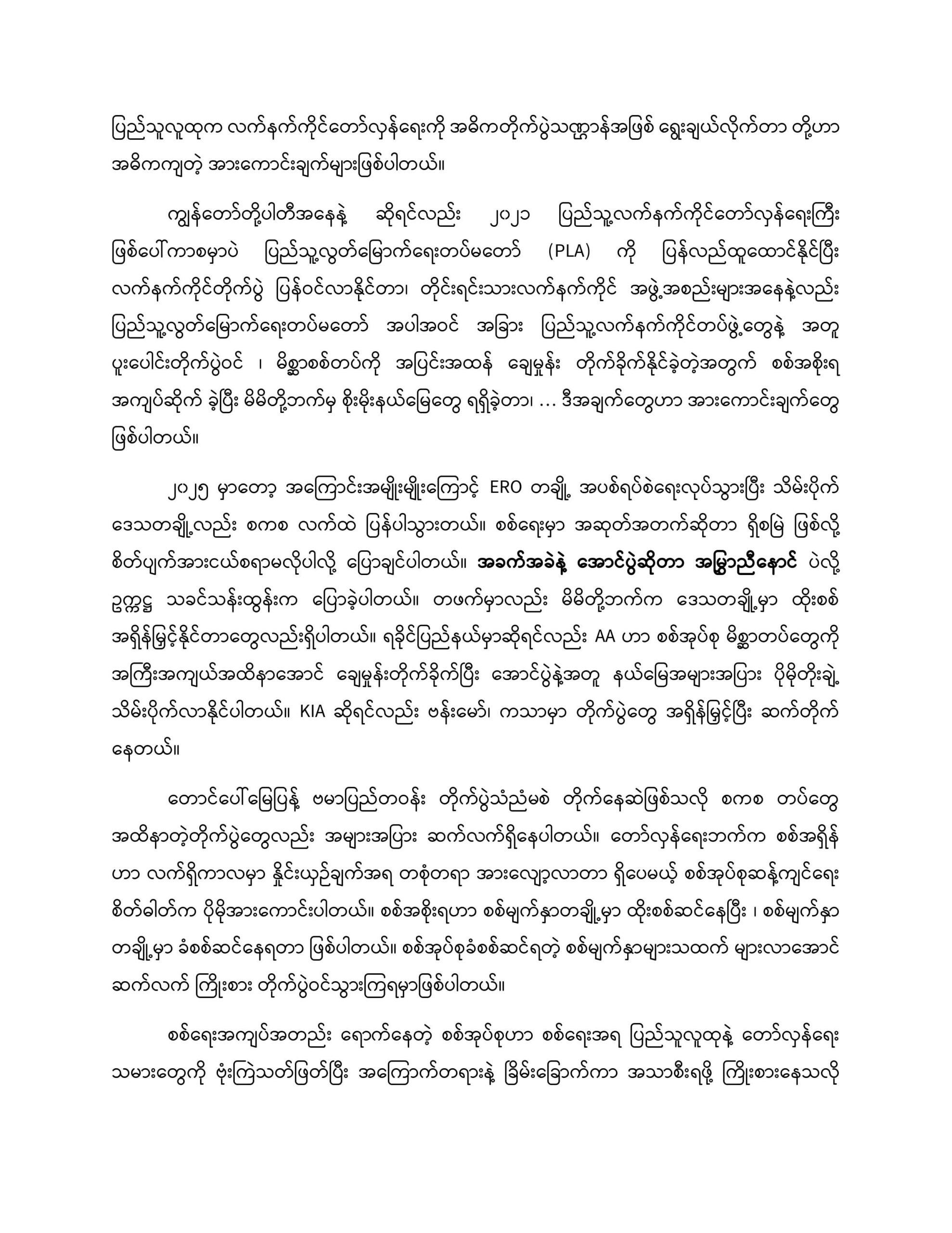 ကျွန်တော်တို့ပါတီအနေနဲ့ ဆိုရင်လည်း ၂၀၂၁ ပြည်သူ့လက်နက်ကိုင်တော်လှန်ရေးကြီး ဖြစ်ပေါ်ကာစမှာပဲ ပြည်သူ့လွတ်မြောက်ရေးတပ်မတော် (PLA) ကို ပြန်လည်ထူထောင်နိုင်ပြီး လက်နက်ကိုင်တိုက်ပွဲ ပြန်ဝင်လာနိုင်တာ၊ တိုင်းရင်းသားလက်နက်ကိုင် အဖွဲ့အစည်းများအနေနဲ့လည်း ပြည်သူ့လွတ်မြောက်ရေးတပ်မတော် အပါအဝင် အခြား ပြည်သူ့လက်နက်ကိုင်တပ်ဖွဲ့တွေနဲ့ အတူ ပူးပေါင်းတိုက်ပွဲဝင် ၊ မိစ္ဆာစစ်တပ်ကို အပြင်းအထန် ချေမှုန်း တိုက်ခိုက်နိုင်ခဲ့တဲ့အတွက် စစ်အစိုးရ အကျပ်ဆိုက် ခဲ့ပြီး မိမိတို့ဘက်မှ စိုးမိုးနယ်မြေတွေ ရရှိခဲ့တာ၊ … ဒီအချက်တွေဟာ အားကောင်းချက်တွေ ဖြစ်ပါတယ်။