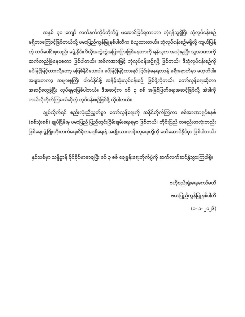 ရွေးကောက်ပွဲကို မဖြစ်ဖြစ်အောင်လုပ်၊ အစိုးရတရပ် ဖွဲ့နိုင်ရင် ပြီးရော လုပ်ပြီး၊ ပေါ်လာတော့မယ့် အစိုးရဟာ ဘယ်လောက်ပဲ သိက္ခာမဲ့သည် ဖြစ်စေ၊ ဘယ်လောက်ပဲ အရှက်မဲ့သည်ဖြစ်စေ ၊ ပြည်သူလူထု က ဘယ်လောက်မလိုလားသည် ဖြစ်စေ မဖြစ်ညစ်ကျယ်နဲ့ မုချပေါ်လာတော့မှာ ဖြစ်ပါတယ်။ ဒါဟာ သူတို့ စစ်အုပ်စုက အပြည့်အဝ ချုပ်ကိုင် ညွှန်ကြားနိုင်ဖို့ သူတို့လိုလားနေတဲ့ စစ်အစိုးရတခုပဲ ဖြစ်ပါတယ်။ ၂၀၀၈ ဖွဲ့စည်းအုပ်ချုပ်ပုံပါ ပြဋ္ဌာန်းချက်များအတိုင်း စစ်အုပ်စုက စိတ်ကြိုက်ချုပ်ကိုင်နိုင်တဲ့ သူတို့ လိုချင်တဲ့ ပုံစံမျိုးနဲ့ အစိုးရတရပ် မရနိုင်ခဲ့လို့ ခုတခါအာဏာသိမ်းပြီး ထပ်လုပ်ခဲ့တာ ဖြစ်ပါတယ်။ ဒီအစိုးရကို ဘယ်လို နာမည်ပဲပေးပေး အနှစ်သာရအရ စစ်အာဏာရှင်အစိုးရတခုပဲ ဖြစ်မှာပါ။