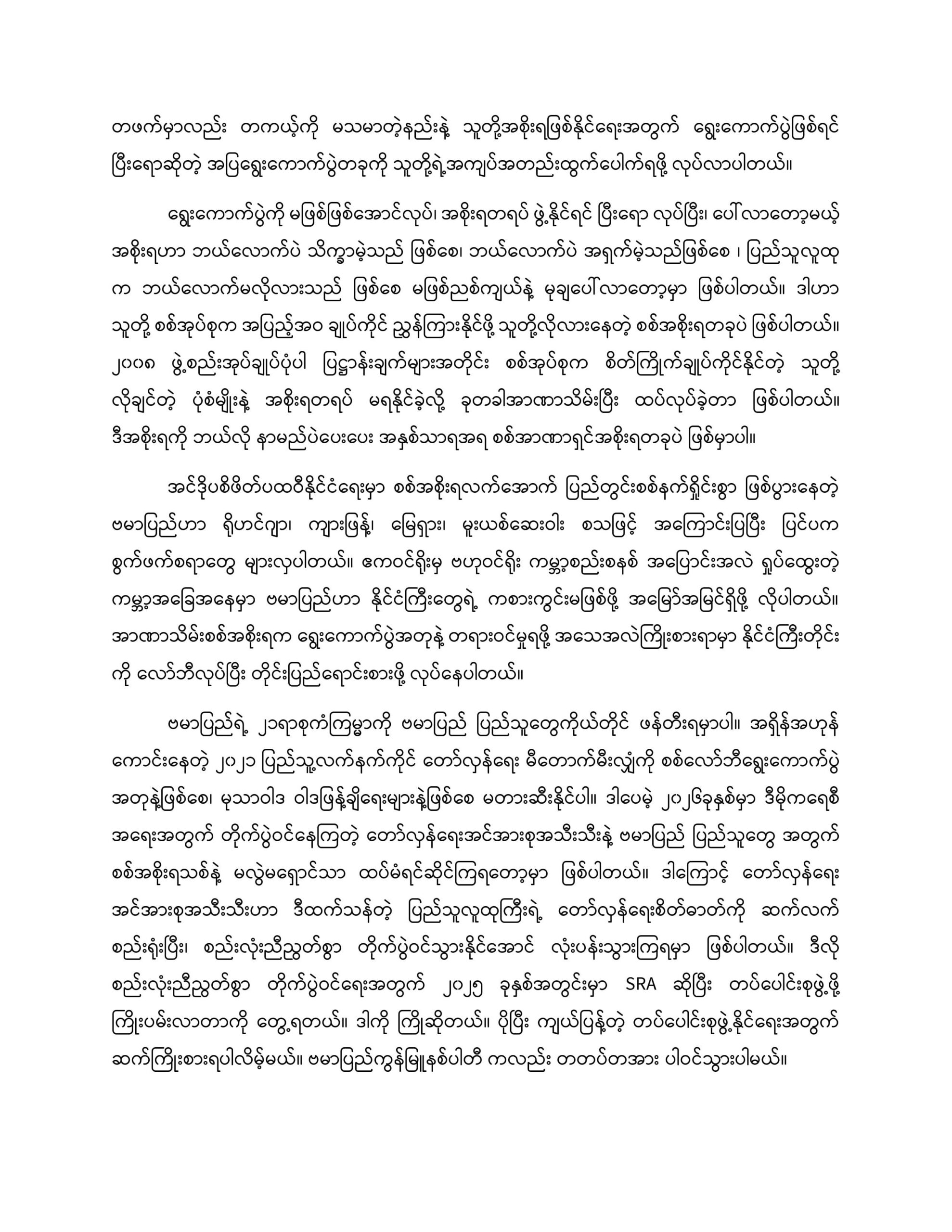 ဗမာပြည်ရဲ့ ၂၁ရာစုကံကြမ္မာကို ဗမာပြည် ပြည်သူတွေကိုယ်တိုင် ဖန်တီးရမှာပါ။ အရှိန်အဟုန် ကောင်းနေတဲ့ ၂၀၂၁ ပြည်သူ့လက်နက်ကိုင် တော်လှန်ရေး မီတောက်မီးလျှံကို စစ်လော်ဘီရွေးကောက်ပွဲ အတုနဲ့ဖြစ်စေ၊ မုသာဝါဒ ဝါဒဖြန့်ချိရေးများနဲ့ဖြစ်စေ မတားဆီးနိုင်ပါ။ ဒါပေမဲ့ ၂၀၂၆ခုနှစ်မှာ ဒီမိုကရေစီ အရေးအတွက် တိုက်ပွဲဝင်နေကြတဲ့ တော်လှန်ရေးအင်အားစုအသီးသီးနဲ့ ဗမာပြည် ပြည်သူတွေ အတွက် စစ်အစိုးရသစ်နဲ့ မလွဲမရှောင်သာ ထပ်မံရင်ဆိုင်ကြရတော့မှာ ဖြစ်ပါတယ်။ ဒါကြောင့် တော်လှန်ရေး အင်အားစုအသီးသီးဟာ ဒီထက်သန်တဲ့ ပြည်သူလူထုကြီးရဲ့ တော်လှန်ရေးစိတ်ဓာတ်ကို ဆက်လက် စည်းရုံးပြီး၊ စည်းလုံးညီညွတ်စွာ တိုက်ပွဲဝင်သွားနိုင်အောင် လုံးပန်းသွားကြရမှာ ဖြစ်ပါတယ်။ ဒီလို စည်းလုံးညီညွတ်စွာ တိုက်ပွဲဝင်ရေးအတွက် ၂၀၂၅ ခုနှစ်အတွင်းမှာ SRA ဆိုပြီး တပ်ပေါင်းစုဖွဲ့ဖို့ ကြိုးပမ်းလာတာကို တွေ့ရတယ်။ ဒါကို ကြိုဆိုတယ်။ ပိုပြီး ကျယ်ပြန့်တဲ့ တပ်ပေါင်းစုဖွဲ့နိုင်ရေးအတွက် ဆက်ကြိုးစားရပါလိမ့်မယ်။ ဗမာပြည်ကွန်မြူနစ်ပါတီ ကလည်း တတပ်တအား ပါဝင်သွားပါမယ်။